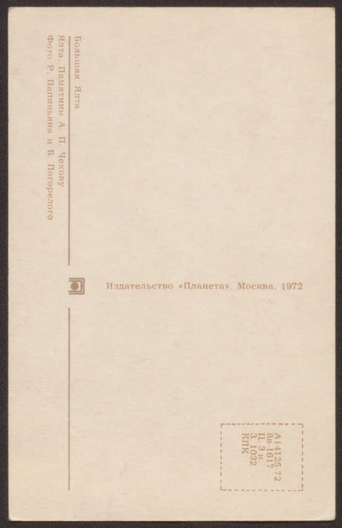 Ялта. Памятник А. П. Чехову [Изоматериал : электронный ресурс] : [открытка] / фото Р. Папикьяна и Б. Погорелого. - Электронные данные (2 файла : 2,5 МБ). -(Санкт-Петербург: Президентская библиотека , 2014). - Режим доступа: интернет-портал Президентской библиотеки. Заглавие с экрана. Открытка является частью комплекта: Большая Ялта / фото Р. Папикьяна и Б. Погорелого. Москва : Планета, 1972. (Курорты СССР). 24 открытки в обложке. 77 коп. Электронная репродукция открытки: Ялта. Памятник А. П. Чехову [Изоматериал] / фото Р. Папикьяна и Б. Погорелого. Москва : Планета, 1972. 1 открытка : цветной офсет. А 14125-72 г. 7/8в-1617. 3 коп. Тираж 210000 экз. Местонахождение: Детский музей открытки, Санкт-Петербург. Копирование пользователями не разрешается.
