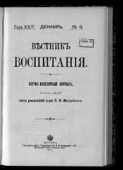 Г. 24. 1913. [Кн. 7-9]. № 9. Декабрь : Науч.-попул. журн. / Издаваемый под ред. д-ра Н.Ф. Михайлова. - Типо-лит. Т-ва И.Н. Кушнерев и К°, 1913. -210, 112, 18, XIV с. : табл.. - Систематический указ. статей, помещенных в "Вестнике воспитания" за 1913 г.: с. 1-18 третьей паг.. - Библиогр. в подстроч. примеч. и в тексте.