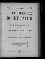 Вестник воспитания : Науч.-попул. журн. для родителей и воспитателей. - Москва, 1898. - Изд-во: Г. 1 1890 - Г. 6 1895 № 6 Ред.-изд. д-р Е.А. Покровский; Г. 6 1895 - Г. 9 1898 № 2 Изд. насл. Е.А. Покровского; Г. 9 1898 № 3 - Г. 28 1917 Ред.-изд. д-р Н.Ф. Михайлов. Подзаг.: Г. 1 1890 - Г. 11 1900 Науч.-попул. журн. для родителей и воспитателей; Г. 12 1901 - Г. 28 1917 Науч.-попул. журн.