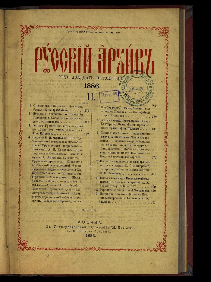 Г. 24 1886, [кн. 3], 11. - В Университетской типографии (М. Катков), 1886. -[164] с.. - Содержит: О кончине царевича Димитрия : статья Н. С. Арцыбышева. Польское показание о Димитрии Самозванце / сообщено о. архимандритом Леонидом. Отзыв Грибоедова об его комедии "Горе от ума" : письмо к П. А. Катенину (с. 287-288 (сканы 17-18)). Записки Н. Н. Муравьева, 1818 год. Архив графа Игельстрома : указы Екатерины Великой / с предисловием графа Д.А. Толстого, [и др.]. - Библиография в подстрочных примечаниях и в тексте.