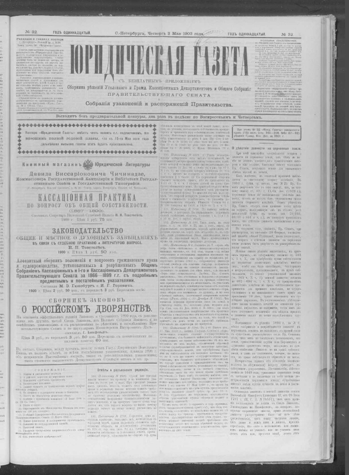 Юридическая газета : выходит без предварительной цензуры. - 1892, 4 января - [1906]. -Санкт-Петербург, 1892-1906. - "Юридическая газета" с бесплатным приложением Сборника решений Уголовного и Гражданского департаментов и общего собрания правительствующего сената, а с 1895 и Собраний узаконении и распоряжений правительства - выходила в Петербурге с января 1892 по 1906, 2 раза в неделю, по воскресеньям и четвергам. Редакторы - Е. Антонов, Д. В. Чичинадзе, М. В. Чичинадзе. Материалы газеты печатались под рубриками: Законодательная хроника в России, Обзор постановлений отечественного и иностранного законодательства, Статьи и заметки по вопросам, возникающим в судебной и административной практике, Корреспонденции из России, Выдающиеся судебные процессы, Речи известных адвокатов. С № 6 1906 стала выходить в виде брошюр. Алфавитный указатель статей за 1901 год: в № 32 за 30 декабря 1901 г.. - Алфавитный указатель к "Юридической газете" за 1892 и 1893 гг. - Санкт-Петербург, 1894. - Приложения: "Сборник решений Уголовного и Гражданского кассационных департаментов и Общего собрания Правительствующего сената" и "Собрание узаконений и распоряжений Правительства".