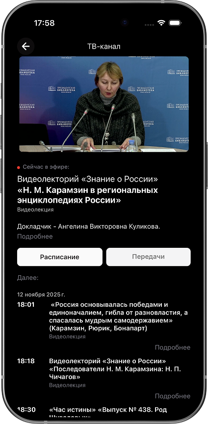 – смотреть трансляции исторических передач и лекций ведущих экспертов на ТВ-канале Президентской библиотеки;