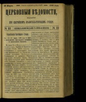 Церковные ведомости, издаваемые при Святейшем правительствующем Синоде : еженедельное издание с прибавлениями. - Санкт-Петербург, 1888-1918. - Выходит в 2-х частях: официальная и неофициальная. Неофициальная часть выходит под заглавием: Прибавления к Церковным ведомостям. За 1915-1916 гг. приложение к газете: Приходский листок. Заглавие: 1888-1917 № 8, 1918 № 1-3/4 Издаваемые при Святейшем правительствующем Синоде. Еженедельное издание с прибавлениями ; 1917 № 9/15-48/49 ... Еженедельное издание ; 1918 № 5-19/20 Издание православной русской церкви. Еженедельное издание с прибавлениями ; 1918 № 21/22 Издание православной русской церкви. Издание с прибавлениями ; 1918 № 23/24 Издание православной русской церкви. Издательство: 1918 № 1-3/4 Издательский совет при Святейшем Синоде ; 1918 № 5-23/24 Издательский совет при Священном Синоде. Приложения: Приходское чтение ; Определения Синода, молитвы, листовки, воззвания и т.п. : 101 брошюра. Алфавитно-предметный указатель к официальной части "Церковных ведомостей" за 1888-1897 годы : приложение к журналу. Санкт-Петербург, 1899. - Алфавитно-предметный указатель к официальной части "Церковных ведомостей" за 1898-1910 годы : приложение к журналу ... 1911, № 1-46. Санкт-Петербург, 1911.