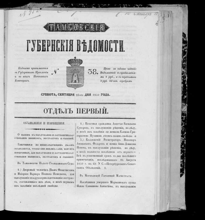 Тамбовские губернские ведомости. 1850, № 38 (23 сентября)