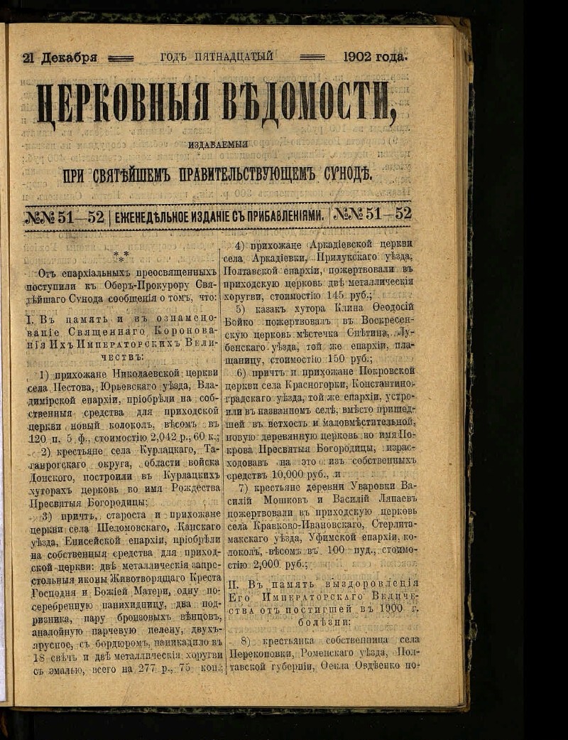 Церковные ведомости, издаваемые при Святейшем правительствующем Синоде. Г. 15 1902, № 51/52 (21 декабря)