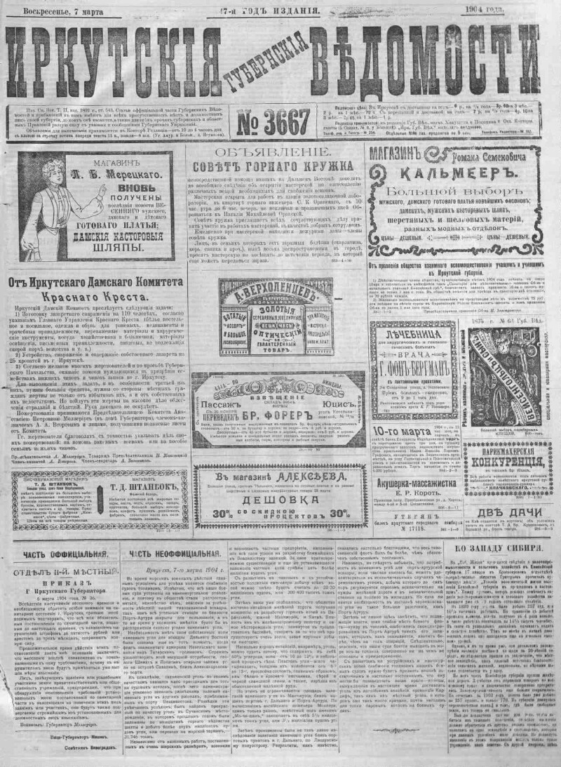 Иркутские губернские ведомости. 1904, № 3667 (7 марта).