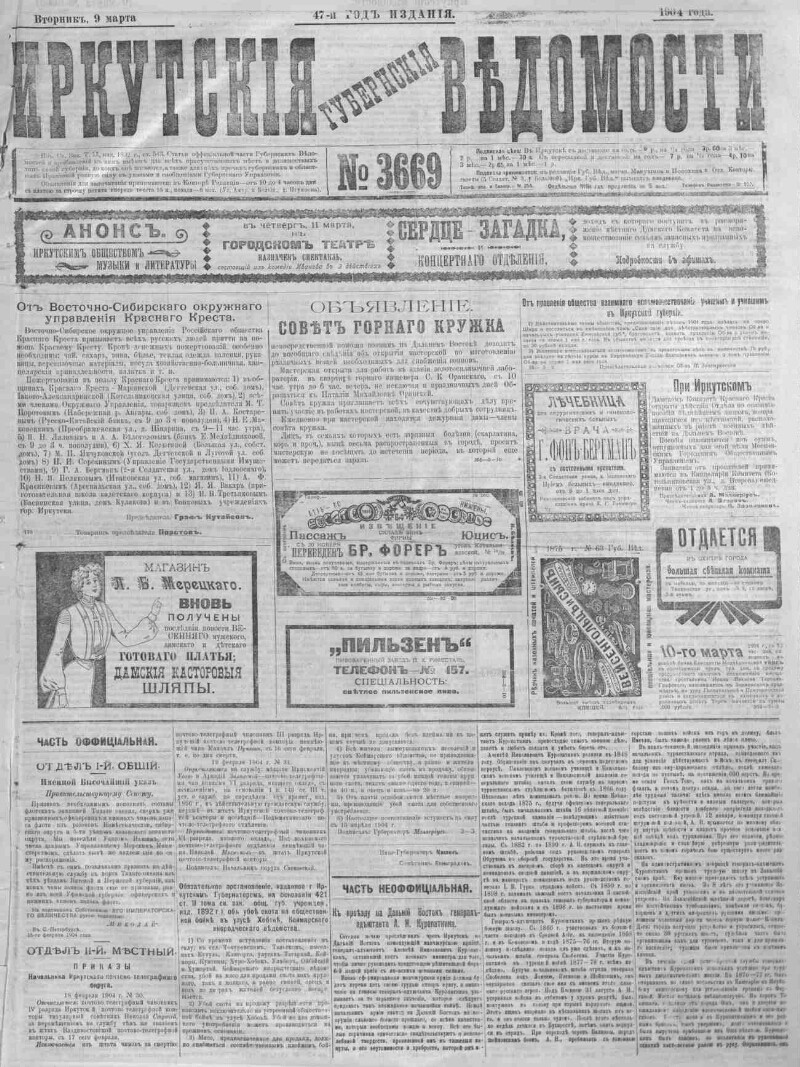 Иркутские губернские ведомости. 1904, № 3669 (9 марта).