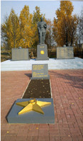The sculpture consists of the Eternal Flame and the figure of a soldier, with located at the edges of stele. On plates are immortalized the names of soldiers who died there. The obelisk was constructed by sculptor Vitally Shanov.