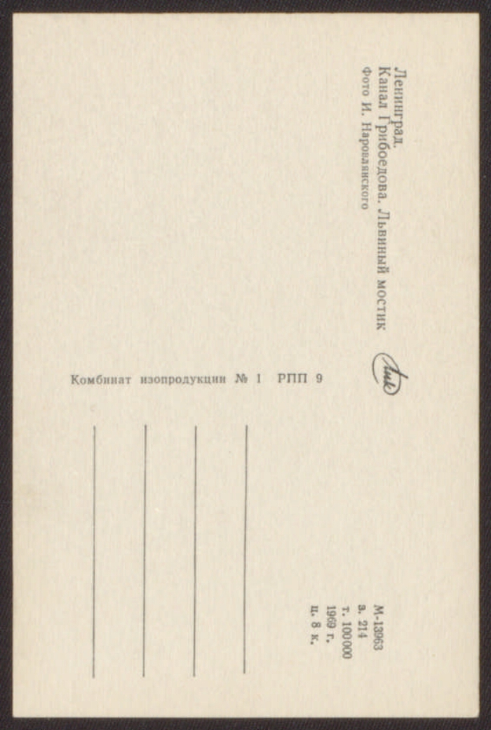 Leningrad. Griboyedov Canal. Lion Bridge [Material: electronic resource]: [postcard] / photo by I. Narovlyansky. - Electronic data (2 files: 1 MB). - (St. Petersburg: Presidential Library, 2018). - Access Mode: Presidential Library Internet Portal. Screen Title. Electronic Reproduction of Postcard: Leningrad. Griboyedov Canal. Lion Bridge [Pictorial material] / photo by I. Narovlyansky. Plant izoproduktsii number 1, 1969. 1 postcard: offset. M-13963. 8 kopecks Circulation 100,000 copies. Location: Balachenkova, N.V., private collection. Users are not allowed to copy. Postcard from the collection of the famous St. Petersburg collector Natalia Balachenkova, head of the library of the school № 331 in St. Petersburg, the head of the school postcard museum. The collection of N. V. Balachenkova contains more than 10 thousand postcards, among which are postcards with photos of actresses and actors of Soviet cinema, postcards with views of St. Petersburg, greeting cards of the 1950s and 1980s. and etc.