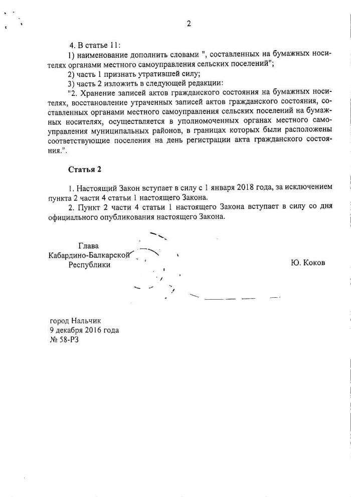 On Amendments to the Law of the Kabardino-Balkarian Republic "On the exercise of state powers for state registration of civil status acts in the Kabardino-Balkarian Republic": Law of the Kabardino-Balkarian Republic of 09.12.2016 No. 58-RZ.- Electronic text data (2 files).- (Moscow: GlavNIVTS UDP of the RF, 2018).-Access mode: Internet portal of the Presidential Library.The titlefrom the title page.Electronic version: Law of the Kabardino-Balkarian Republic of December 9, 2016 No. 58-RZ "On Amendments to the Law of the Kabardino-Balkarian Republic" On the Exercise of State Authorities for the State Registration of Acts of Civil Status in the Kabardino-Balkarian Republic "..Source of electronic copy: PB