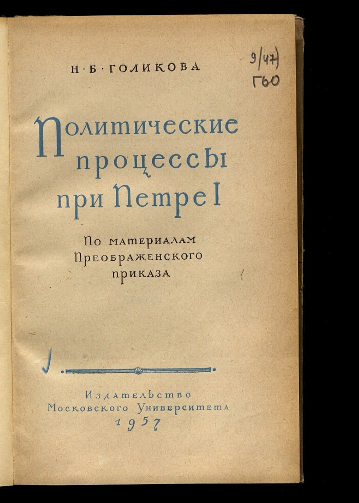 Golikova, Nina Borisovna (1914-2008).Political processes under Peter I: according to the materials of the Preobrazhensky order / N. B. Golikov.- Moscow: Publishing House of Moscow University, 1957. -337 p.;23 cm. -Bibliography in the text and substitution notes..1. Power (collection).2. Romanov’s house (collection).3. Peter I (1672–1725) (collection).4. Political trials - Russia - 18 in ..BBK 63.3 (2) 511-3BBK 67.3 (2) 51Electronic copy source: PBOriginal storage location: BAP