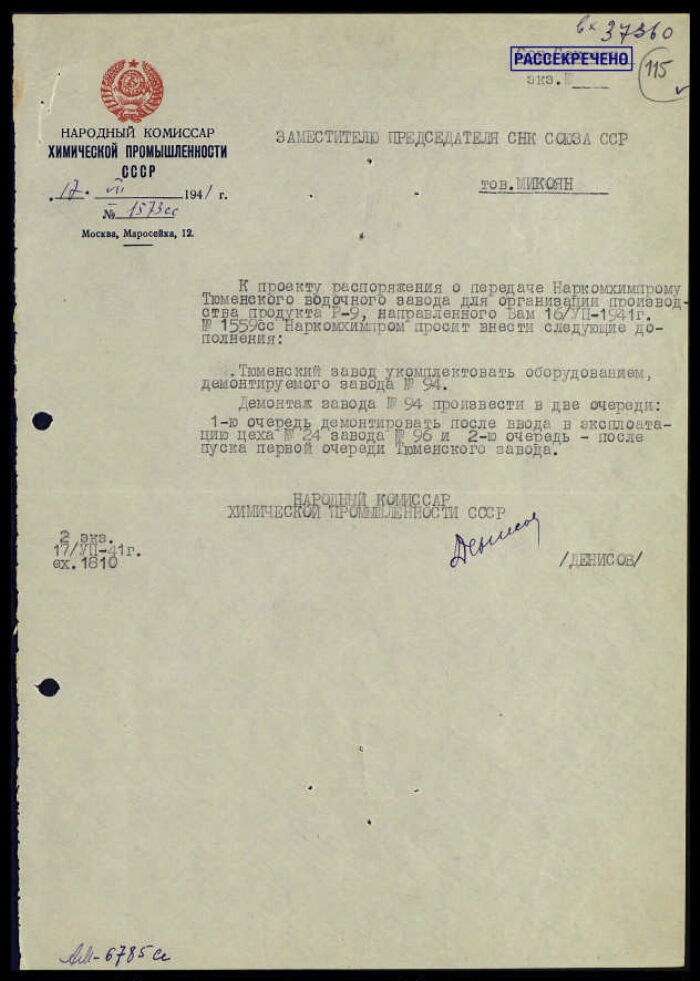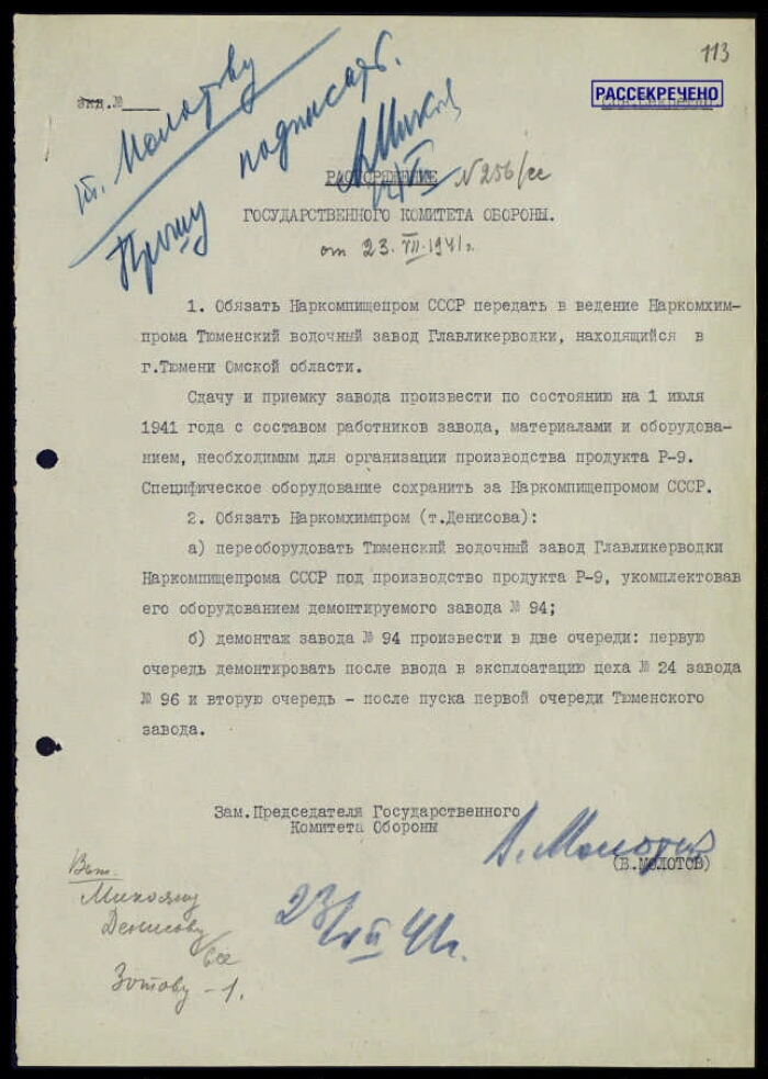 | Title | Order of the USSR GKO No. 256 of the SS on the transfer of the People's Commissariat of the Chemical Industry of the Tyumen Vodka Plant, with the application of notes by Denisov M.F. Mikoyan A.I. |