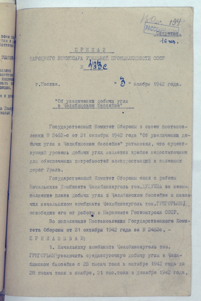 | Title | Order No. 423C of the People's Commissar of Coal Industry of the USSR V.V. Vakhrushev "On an increase in coal mining in the Chelyabinsk basin" |
