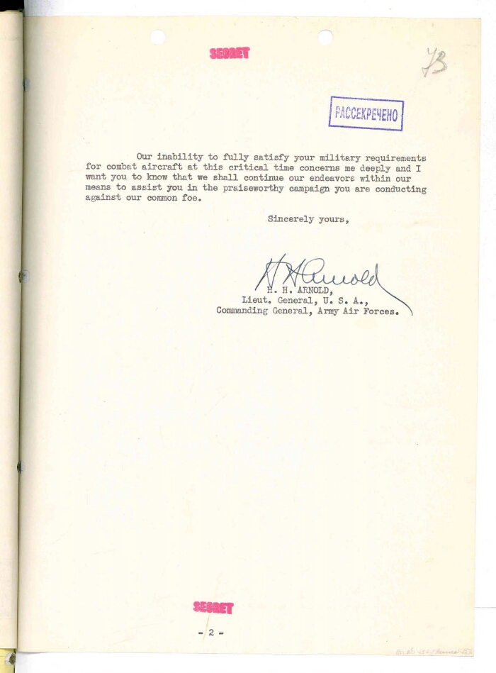 | Title | Letter of the Lieutenant General of the Air Force of the US Army G. H. Arnold to the chairman of the government procurement commission of the USSR to the United States A. I. Belyaev about the impossibility of increasing the supply of combat aircraft to the USSR |