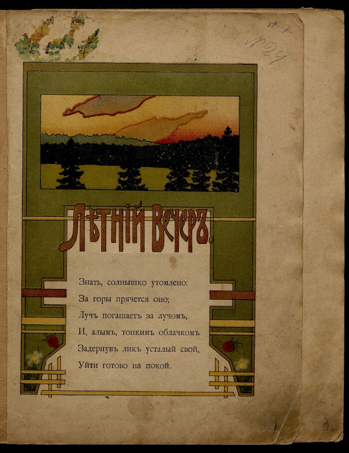 Zhukovsky, Vasily Andreevich (poet; 1783-1852).Summer evening / [Works] V.A. Zhukovsky.- [Moscow]: lithography of the partnership I. D. Sytin, 1917].-[12] p.: col.Il .. -A copy without a title sheet, with handwritten marks..1. The people (collection).2. Russian language (collection).3. V. A. Zhukovsky (collection).4. Russian poetry - 18 - 19 centuries ..BBK 84 (2 = 411.2) 5-5Electronic copy source: PBOriginal storage location: Penza GKM