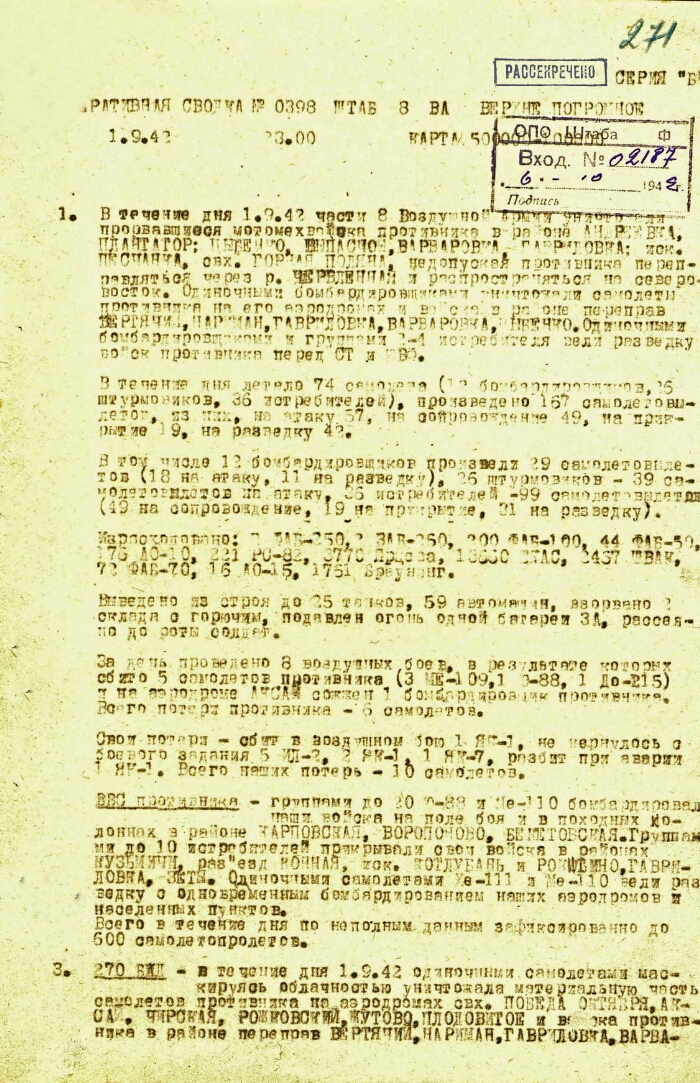 Operational summary No. 0398 of the 8th Air Army of the Stalingrad Front by 23.00