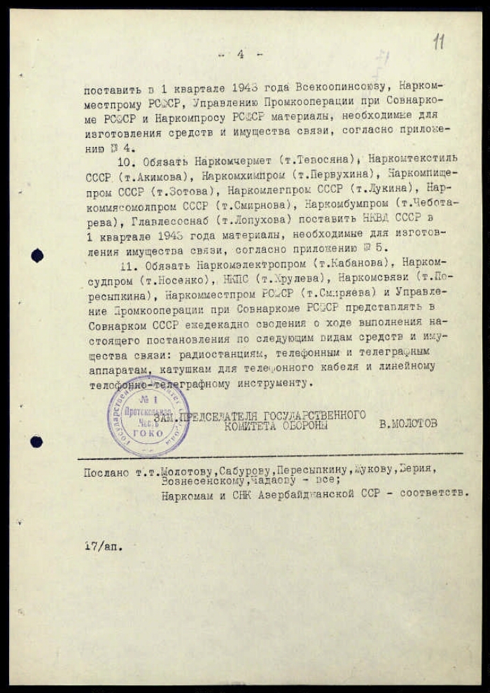 Decree of the USSR GKO No. 2728 SS on the supply of means and property of the People's Commissariat of Defense, the People’s Commissariat of the Navy, the People's Commissariat of the Interior, the Hugwoman, the People's Commissariat of Translation, the People's Commissariat of Communications, the People's Commissariat of the Coal Industry, the People's Commissariat of the River Fleet and the Institute 301 in the 1st quarter of 1943G., with the application of plans for the supply and statements of materials and the memorandum of Saburov M.Z.Molotov V.M.January 10, 1943 |