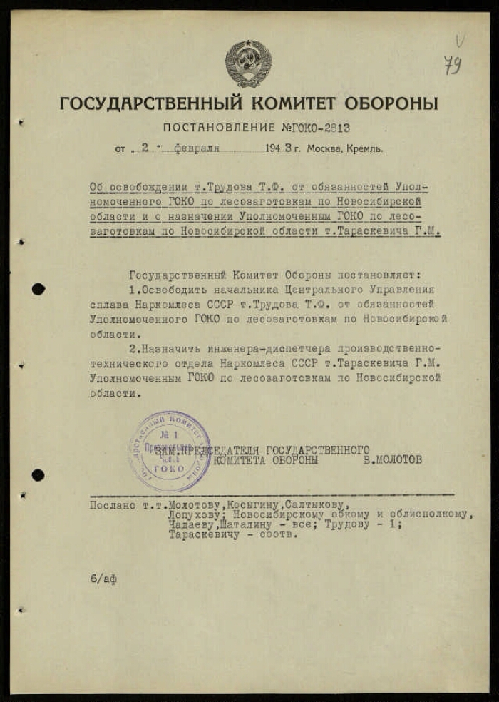 | Title | Resolution of the USSR GKO No. 2813 on the liberation of T.F.From the duties of the authorized GKO for logging in the Novosibirsk region and on the appointment of the authorized GKO for logging in the Novosibirsk region, Taraskevich G.M.February 2, 1943 |