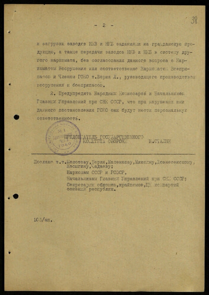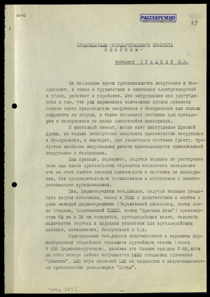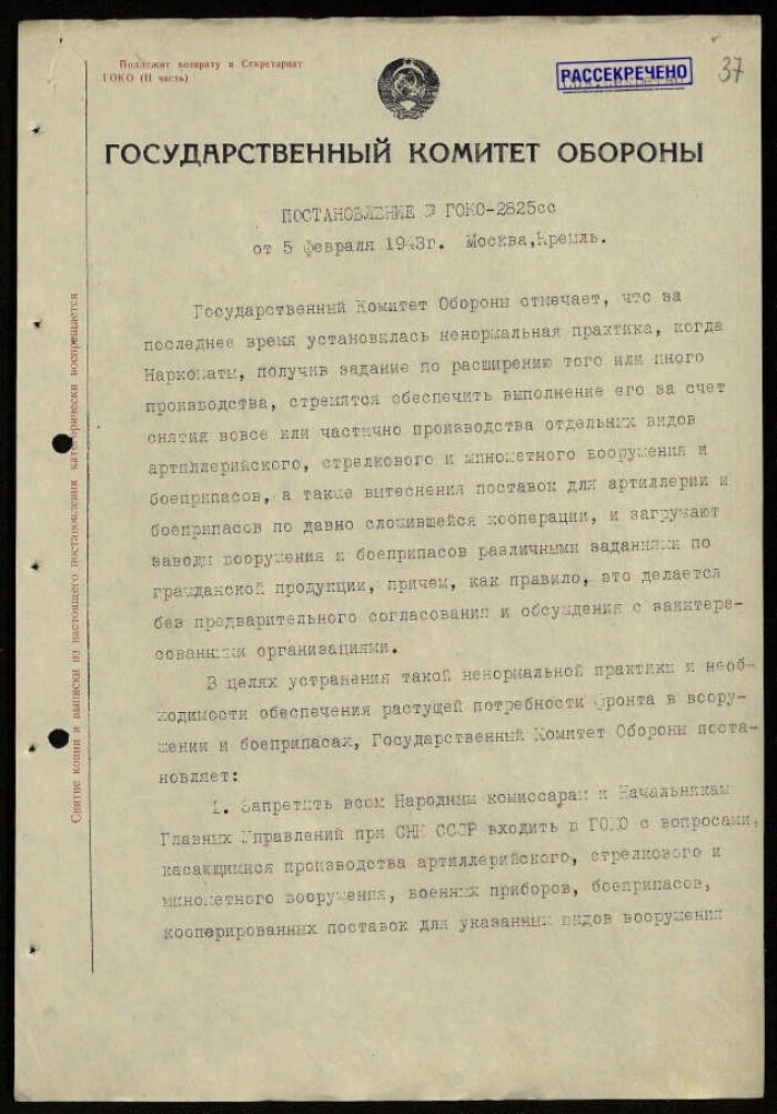 | Title | Resolution of the USSR GKO No. 2825 on the procedure for entering the GKO with questions regarding the production of artillery, small and mortar weapons, military devices and ammunition, with the application of the memorandum of Beria L.P.Stalin I.V.February 5, 1943 |