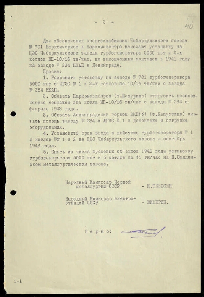 Decree of the USSR GKO No. 2867 C to dismantle and send equipment from Leningrad for the CES of the Chebarkul plant No. 701 of the People's Commissariat of Black Metallurgy, with the application of reports of Tevosyan I.F., Zhimerina D.G.Malenkov G.M., Pavlenko A.S.Malenkov G.M.February 10, 1943 |