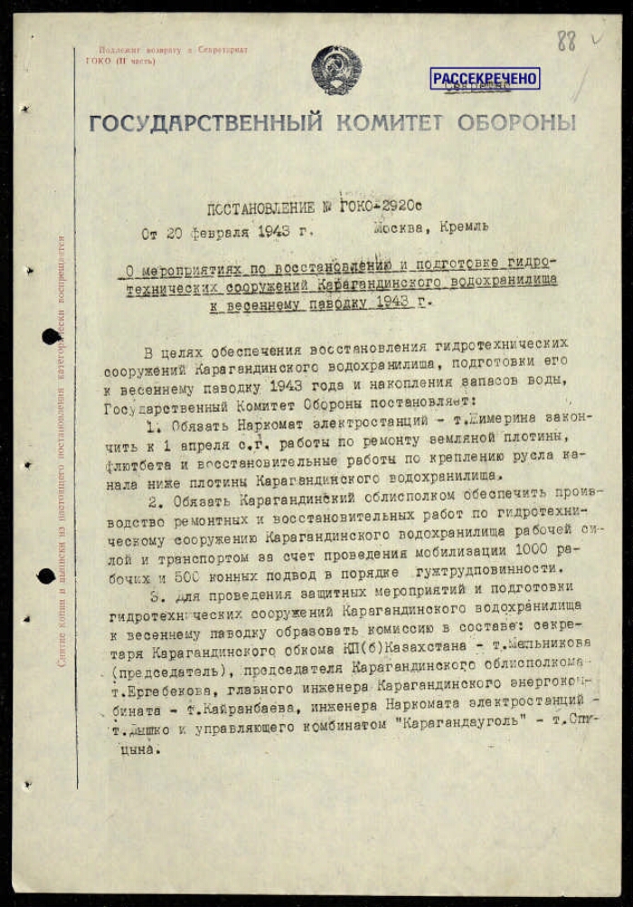 | Title | Decree of the USSR GKO No. 2920 C about measures for the restoration and preparation of hydraulic structures of the Karaganda reservoir for the spring flood, with the appendix of the I. E. Pavlenko, A.S.Malenkov G.M.and telegrams Kiranfaeva Malenkov G.M., Zhimerina D.G.February 20, 1943 |