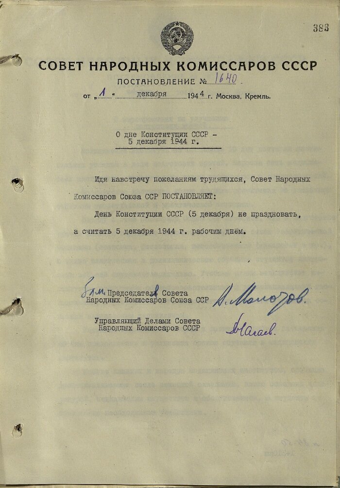 | Title | Decree No. 1640 of the Council of People's Commissars of the USSR "On the Day of the Constitution of the USSR - December 5, 1944" Script.December 1, 1944 |