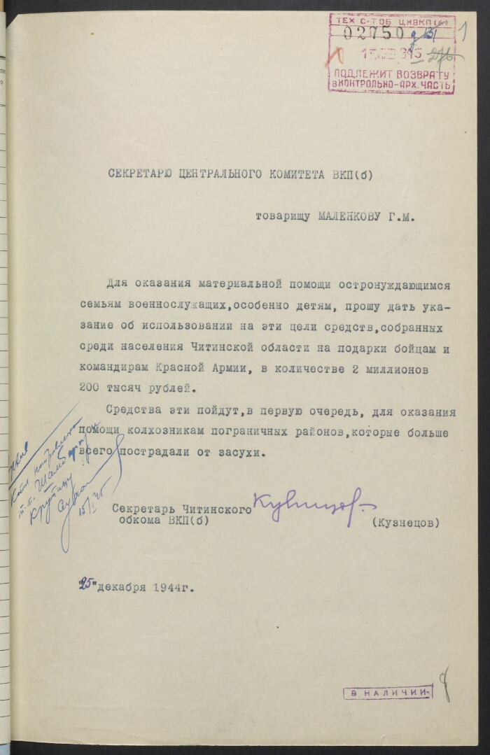 | Title | A report note by the secretary of the Chita regional committee of the CPSU (b) I. A. Kuznetsova G. M. Malenkov on the provision of material assistance to the needy families of military personnel |