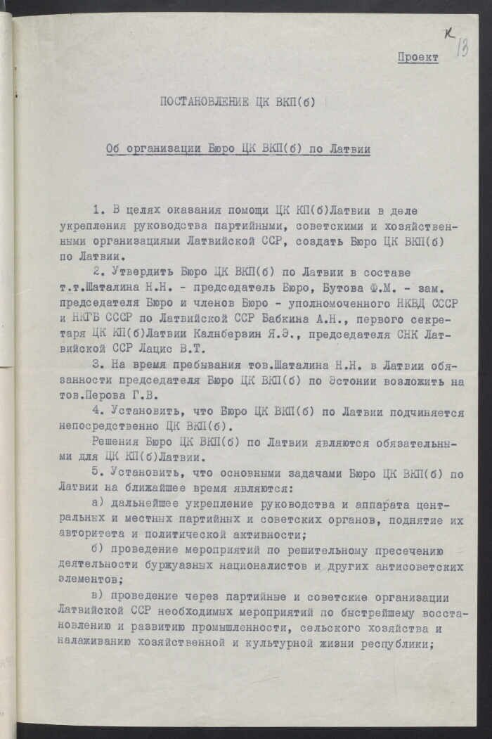 | Title | Resolution of the Politburo of the Central Committee of the All -Union Communist Party of Bolsheviks "On the organization of the Bureau of the Central Committee of the CPSU (b) in Latvia" |