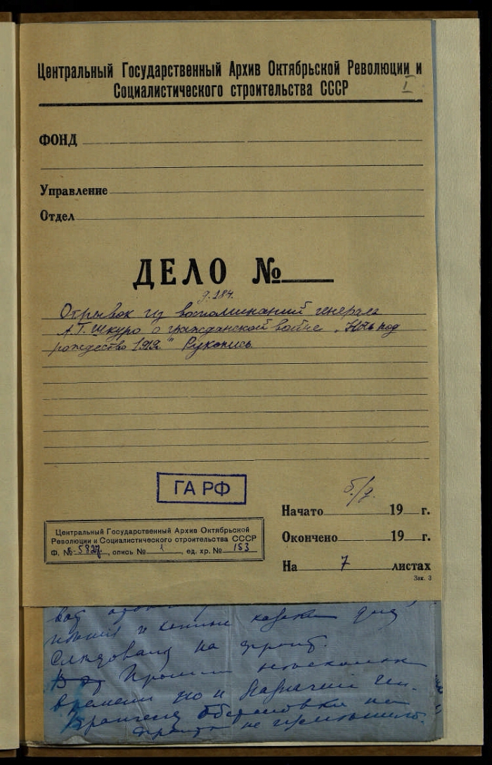 | Fonds | Denikin Anton Ivanovich, Lieutenant-General, Commander-in-Chief of the Armed Forces in the South of Russia |