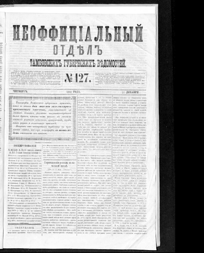 Tambov Province Gazette. - 1838, January 8 - [?]. -Tambov, 1838-1917. - The newspaper was published at the Tambov Provincial Board from 1838. Initially, it was published weekly, from the half of 1876, twice a week, and from the year 1877 it was published three times a week. From 1838 to March 1, 1907 came out in two parts: official and unofficial; from 1838 to March 1845, the unofficial part was published as an addendum to the number. Bibliography: Index of articles placed in the informal department of the "Tambov Provincial Gazette" for 1870 - 1877. / MP Grigorovsky; Index of articles placed in the informal department of the "Tambov Provincial Gazette" for 1838 - 1840. / Solovsky VV; Index of articles placed in the informal department of the "Tambov Provincial Gazette" for 1841 - 1842