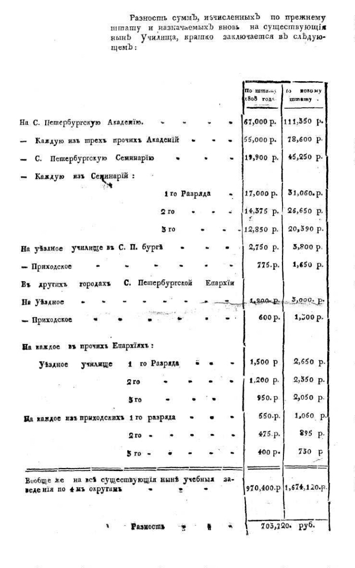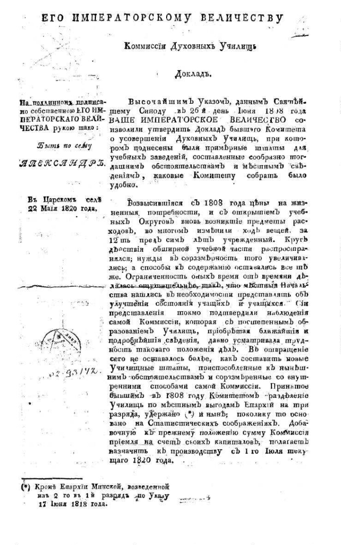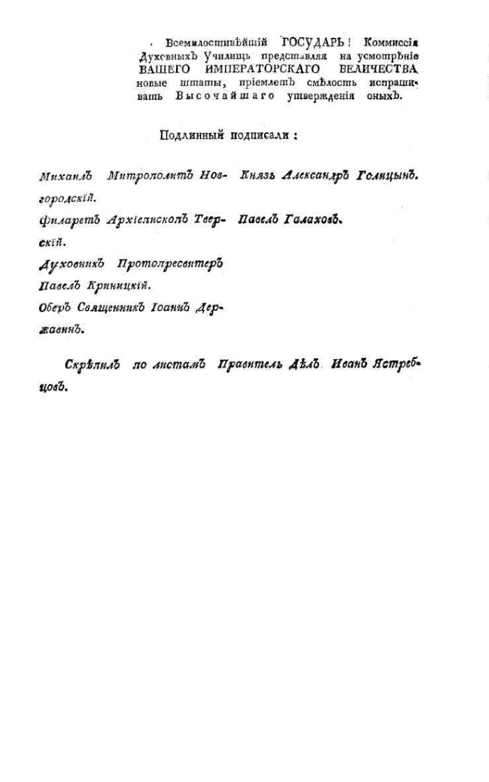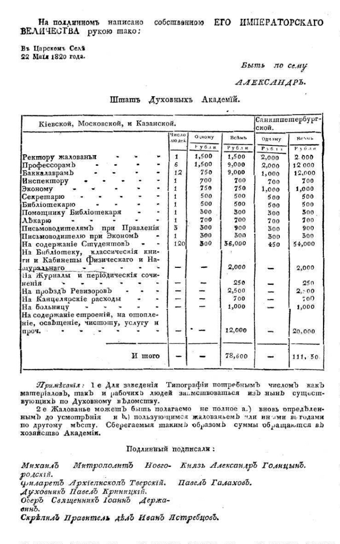 His Imperial Majesty Commissions of the spiritual schools report [on changes in the states of theological schools. Approved on May 22, 1820]. - [B. m.], [18--]. - [20] sec .: tab. ; 2 ° (33 cm). - 2 books. The report was signed by Mikhail the Metropolitan of Novgorod. Filaret the Archbishop of Tver. Confessor Protopresbyter Pavel Krinitsky, Ober Priest John Derzhavin. Prince Alexander Golitsyn. Pavel Galakhov. Ivan Yastrebtsov, the ruler of the cases, attached the sheets to the sheets. In Table. there are data on the states of theological academies, seminaries, county and parish schools .. - Consolidated catalog of the Russian book 1801-1825