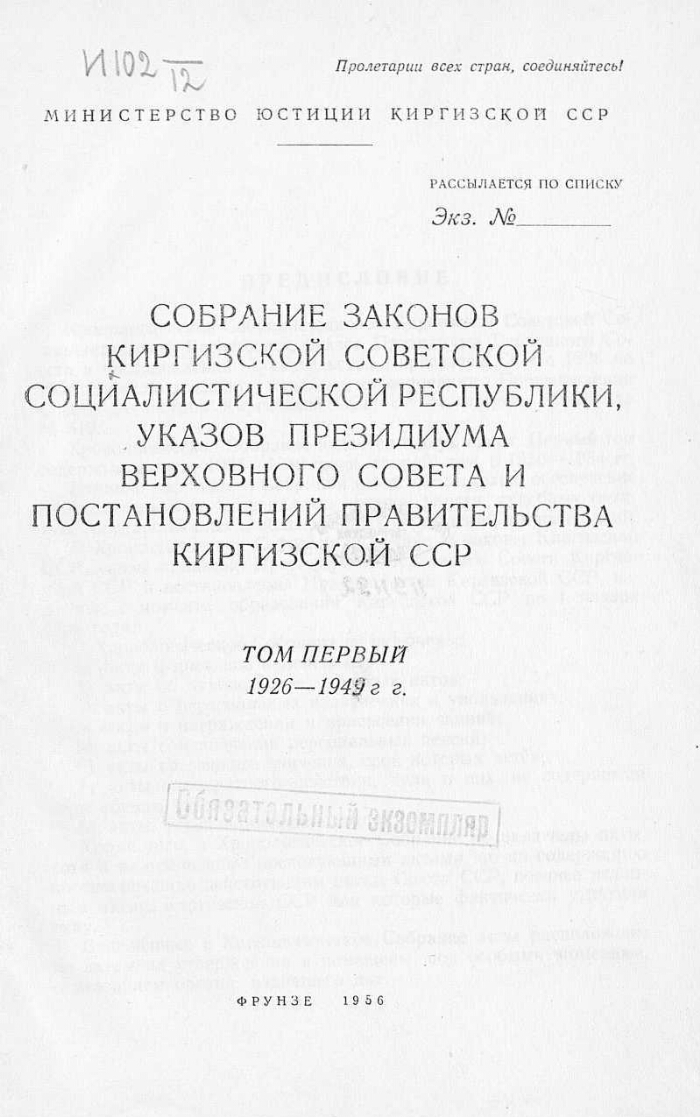 The collection of laws of the Kirghiz Soviet Socialist Republic, decrees of the Presidium of the Supreme Council and resolutions of the Government of the Kirghiz SSR / Ministry of Justice of the Kirghiz SSR. - Frunze: Kirgizgosizdat, 1956. -2 tons; 22 cm. - On the 4th with. t. 1 compilers: S. Berdaliev, S. M. Braslavsky, B. N. Zasuhin and others.