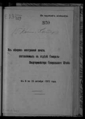 Russia.General base.Department of the Layman-Starmaster.From the reviews of foreign press, compiled in the Department of the General Staff General General.- B. M.: B., 1915. -Not refundable..Electronic Source: PBFrom October 8 to 15, 1915.- [Field type.Headquarters of the 1st Army, 1915].-13 s .. -Bibliogr.in the text..Electronic Source: PB