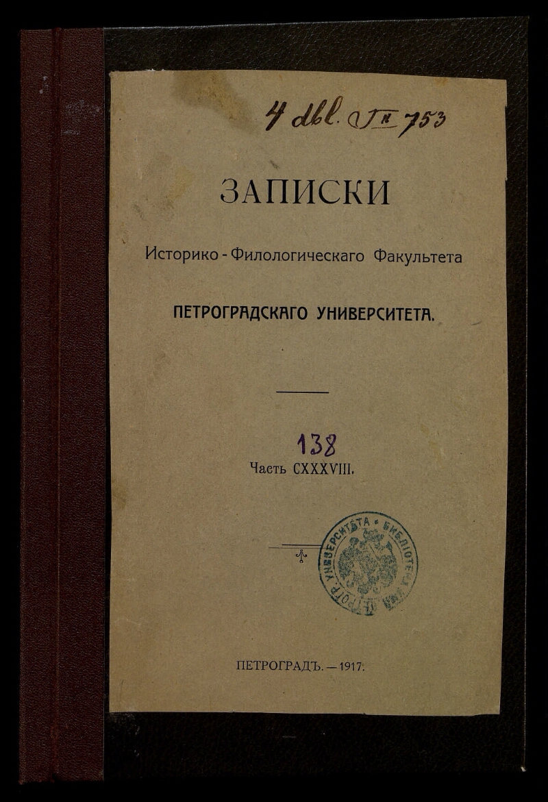 Notes of the Historical and Philological Faculty of St. Petersburg University. - St. Petersburg, 1876-1917. - Закл: Ч. 1 (1876) - 120 (1914) Notes of the Historical and Philological Fact. S.-Petersburg. un-ta; Part 121 (1914) - 140 (1917) ... of the Petrograd ... Place of publication: Part 1 (1876) - 120 (1914), 122 (1914) - 140 (1917) St. Petersburg; Part 121 (1914) M. [Contained. Part 1-140] (1917. - Part 140. - at the end of the book). Systems. decree. to the period. ed. S.-Petersburg. - Leningrad University (1876-1956). L., 1959 (code 721 / B-51).