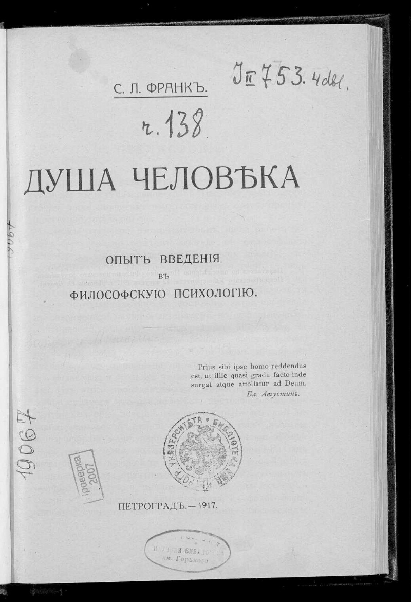 Ch 138: The soul of man: The experience is introduced. in the filos. psychology. - Petrograd, 1917. - [262] p. Sec. pag .. - Bibliograf. in the text.