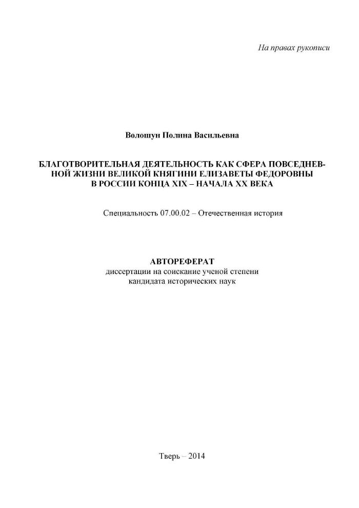Charity as a sphere of everyday life of the Grand Duchess Elizabeth Feodorovna in Russia at the end of the XIX - beginning of the XX century / Voloshun P.V. - Tver, 2014. - 605: Power, People.