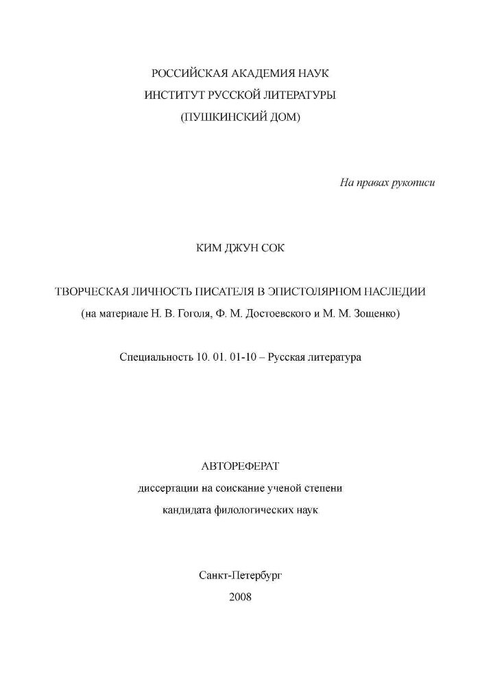 Creative personality of the writer in the epistolary heritage (on the material of NV Gogol, FM Dostoevsky and MM Zoshchenko) / Kim Jun Sok. - Sankt-Petersburg, 2008. - 605: Russian language.