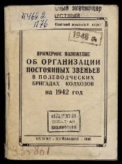An approximate provision on the organization of permanent links in the field teams of collective farms in 1942 / [Kuybyshevsky] region. land department. - Kuibyshev: Oblgiz, 1942.-62, [1] p. : tab. - Ex: without reg., with rukop. litter.