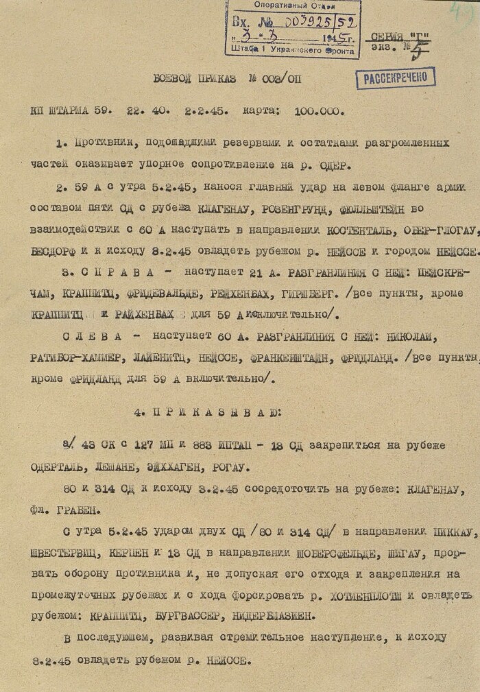 Combat Order No. 003/OP for the 59th Army of the 1st Ukrainian Front on the development of an offensive in the direction of the river.Neissa and the capture of G. Neiss during the Visli-Oder offensive operation