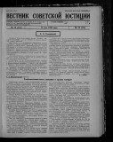 Bulletin of Soviet Justice: a two-week magazine / organ of the People's Commissariat of Justice of the Ukrainian SSR and the Legal Society of the Ukrainian SSR. - Kharkov: The Legal Publishing House of the NKYU of the Ukrainian SSR, 1922-1928. - Headings: Bulletin of Soviet Justice in Ukraine (1922, No. 1-2), News of Radiansky Justice (1929-1930), Revolutionary Right (March 1931 - May 1941), Radyanske Right (1957-1991), Law of Ukraine since 1992). Subtitle: 1922 No. 3 / 4-5 / 7 Monthly Journal of the People's Commissariat of Justice of the Ukrainian SSR; 1923 No. 2 - 1925 Two-week magazine: the organ of the People's Commissariat of Justice of the Ukrainian SSR and the Ukrainian Juridical Society; 1926-1928 Two-week magazine of the People's Commissariat of Justice and the Legal Society of the Ukrainian SSR. Publisher: 1922 People's Commissariat of Justice; 1923 No. 2 People's Commissariat of Justice and UYURO; 1923 No. 3 - 1928 Legal publishing house of the NKYU of the USSR. First editor - Evsei Gustavovich (Gdalievich) Shirvindt (1891-1958), Doctor of Law, Professor. The magazine had branches in Kiev, Odesa, Ekaterinoslav, Artemovsk, Poltava and Moscow. The journal printed articles of a general state and political nature, theoretical developments in various branches of law, highlighted the practice of law enforcement agencies, courts, arbitration, information was provided on the legal life. Among the authors of the scientific articles are: Professors M. Grodzinsky, V. Trakhterov, V. Gordon, V. Koretsky, S. Landkof, G. Matveyev, D. Suslo, S. Tikhenko and others.