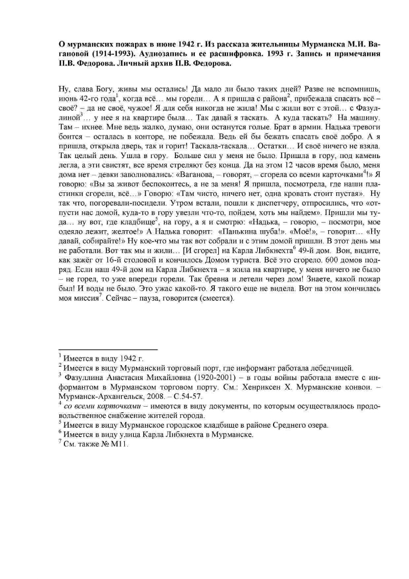 On Murmansk fires in June 1942 [Sound recording: electronic resource]: a fragment of an interview with Maria Ivanovna Vaganova / interviewed by P. V. Fedorov. - Electronic audio and text data (1 audio file: 6.5 MB, 1 file, JPEG: 1.3 MB). - Murmansk, March 7, 1993. - Access mode: the Internet portal of the Boris Yeltsin Presidential Library. The title from the accompanying document. The location and date of the audio recording: Murmansk, March 7, 1993. . Duration: 3 min 18 sec. The resource contains two files: audio recording and decoding of audio recordings in text form. In the recollection story of the honorary citizen of Murmansk, the Chevalier of the Order of Lenin, Maria Ivanovna Vaganova, her impressions of tragic bombardment of Murmansk by Hitler's aviation in June 1942.