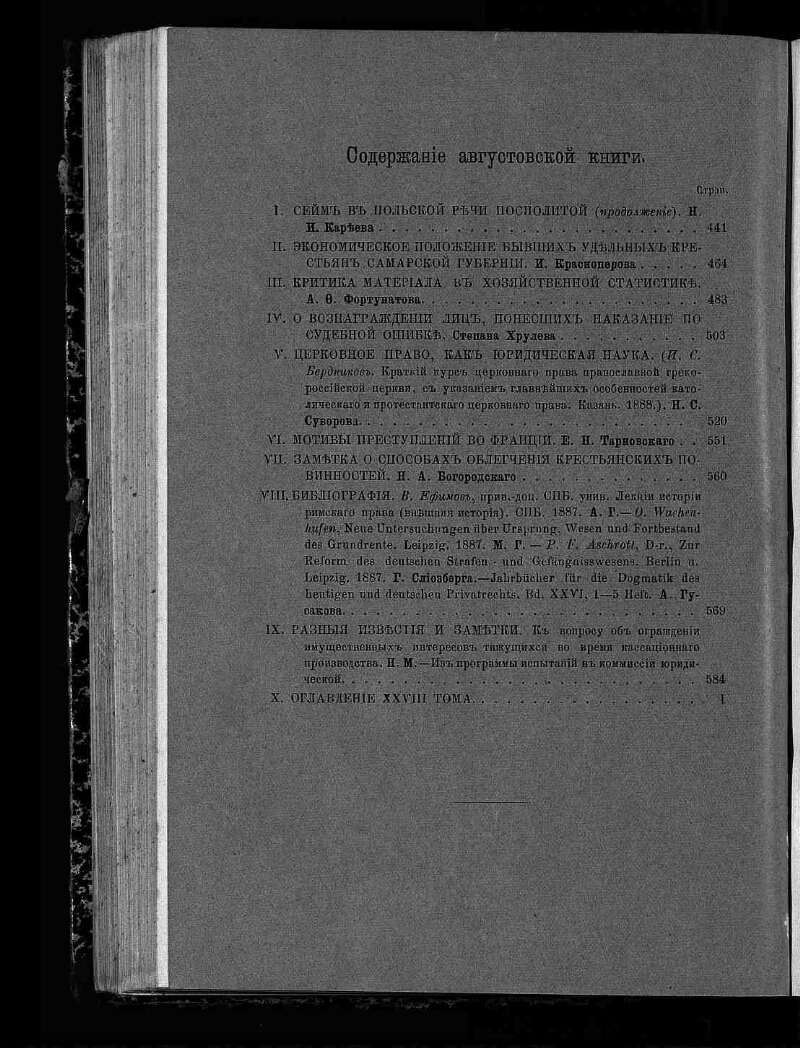 G. 20 1888, v. 28, [No. 8], book. 4, (August). - Typography AI Mamontov and K, 1888. - P. 441-593, III: tab. - Ver. reg. : The Legal Herald, the edition of the Moscow Juridical Society. No. 8. Year XX. August. 1888. Volume XXVIII. Contents: The Sejm in the Polish Commonwealth (continued) / [op.] NI Kareeva. The economic situation of former peasants in the Samara province / [op.] I. Krasnoperova. Criticism of the material in economic statistics / [op.] AF Fortunatova. On the remuneration of persons who were punished by a judicial error / [op. ] Stepan Khrulev. Ecclesiastical Law as a Legal Science (IS Berdnikov, A Short Course of Church Law of the Orthodox Greek-Russian Church, with Indication of the Main Features of Catholic and Protestant Church Law, Kazan, 1888) / [op.] NS Suvorova. Motives of crimes in France / [op.] E. N. Tarnovsky. A note on ways to facilitate peasant obligations / [op.] NA Bogorodsky, [and others]. - Bibliography: p. 569-583