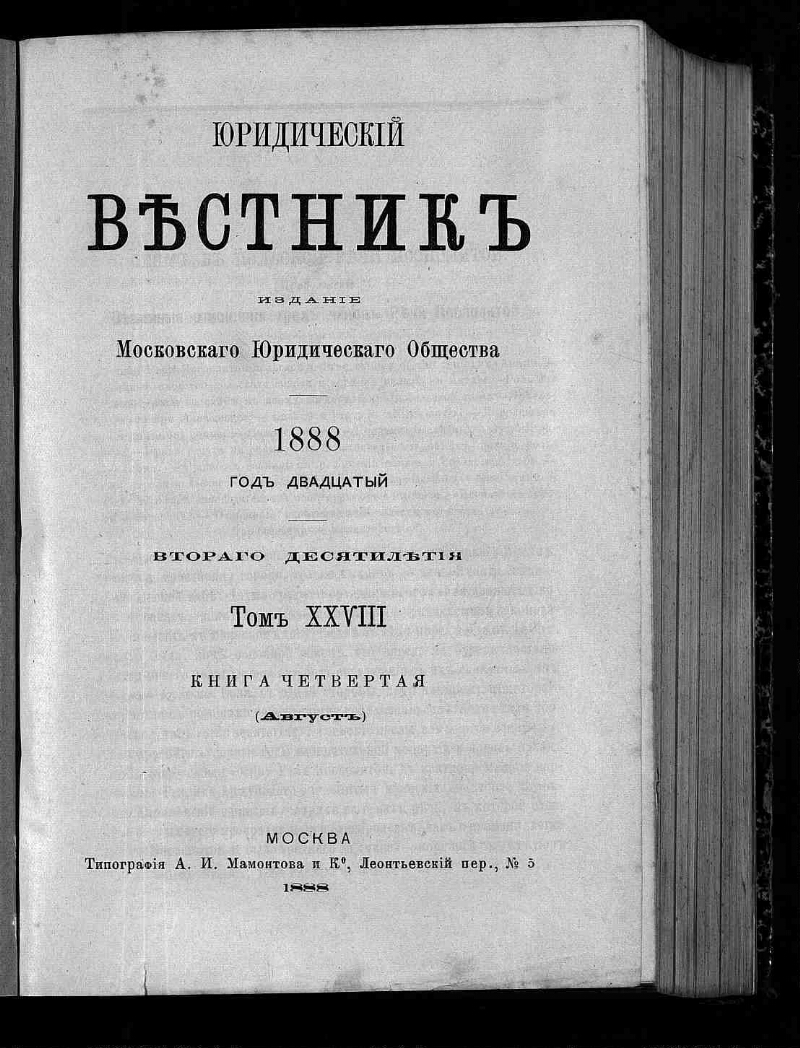 The legal bulletin: the edition of the Moscow legal society. - G. 1 1867, book. 1 (July) - G. 24 1892, V. 12. - Moscow, 1867-1892. - Editors: NV Kalachev (1867-1870), since 1872 - VN Leshkov and AM Fal'kovskii, since 1878 - VN Leshkov, MM Kovalevsky and S A. Muromtsev; from 1880 until the end of the main and permanent editor was SA Muromtsev, and as a second editor were different faces, often replaced (VN Leshkov, MM Kovalevsky, VA Goltsev, V. M Przewalski). The magazine without preliminary censorship was published in Moscow in 1867-1892 by the Moscow Law Society and in St. Petersburg (from 1860 to 1864 as an appendix to the Archive of Historical and Practical Information). He left the city from July 1867 to June 1868, after a six-month break in 1869, then ceased and resumed only in April 1871, after which he left regularly until the end of 1892. Back to text 186 / 1868-1877 Legal Gazette issued by the Moscow Law Society; 1877-1892 The legal bulletin. Subd: 1877-1892 The edition of the Moscow legal society. It turns out instead of "the Legal newspaper"