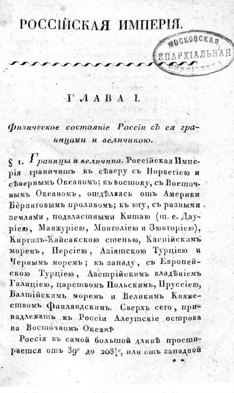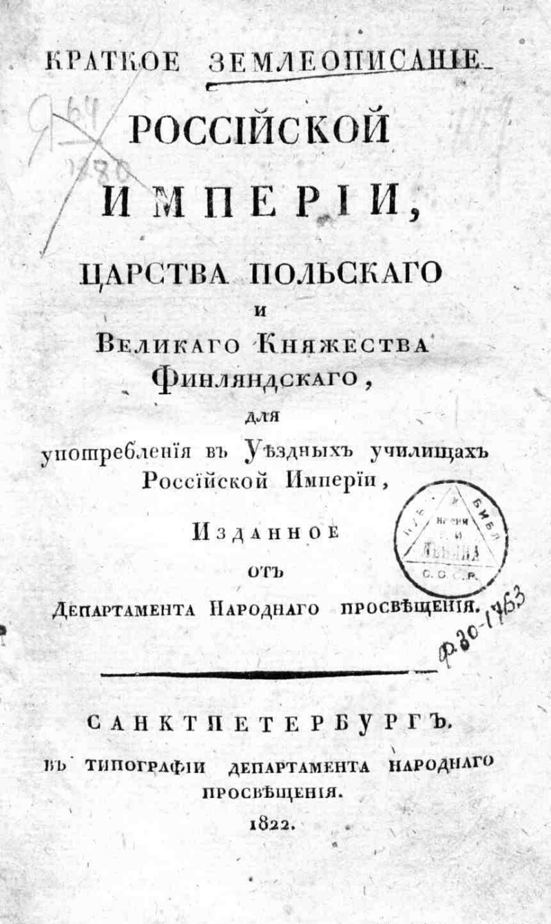 A brief description of the Russian Empire, the Kingdom of Poland and the Great Principality of Finland, for use in the county schools of the Russian Empire, / Published from the Department of People's Education. - Sankt-Petersburg: In the printing house of the Department of People's Education, 1822. - 263, [1] p. ; 8 ° (19 cm). - There are errors in the column numbers. - Consolidated catalog of the Russian book 1801-1825.