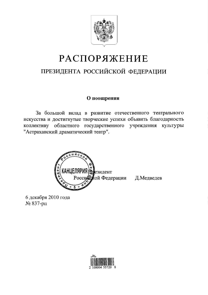 1. Astrakhan Drama Theater - Team - Awards and promotions - Legal acts. 2. Power (collection). 3. Orders of the President of the Russian Federation. |