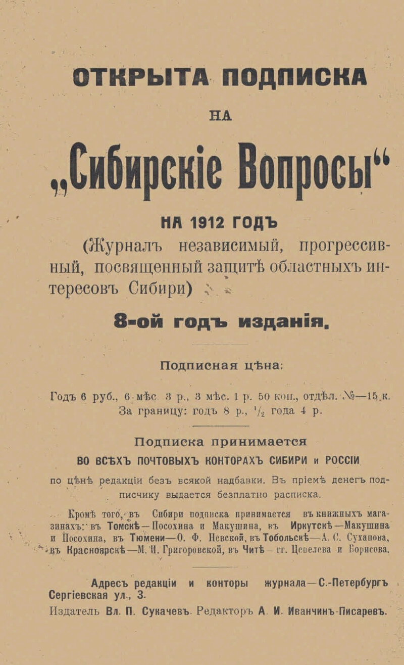 No. 40-52 .- St. Petersburg, 1911 .- 96, 142, 93, [5], 148, [10], 150, [7] p. .- Content: Without anger and hobby; Siberia and the elections to the State Council / N.N .; State drainage works in Siberia / N.S .; Peasant guardians; "Calmed down" ... / Bonnard S .; Siberian letters: 1. Tobolsk. 2. The mound; Article 87 in Tobolsk / A.H .; Cultural holiday of the Yenisei province; Siberian deputies; Essays on Siberian Life / LK