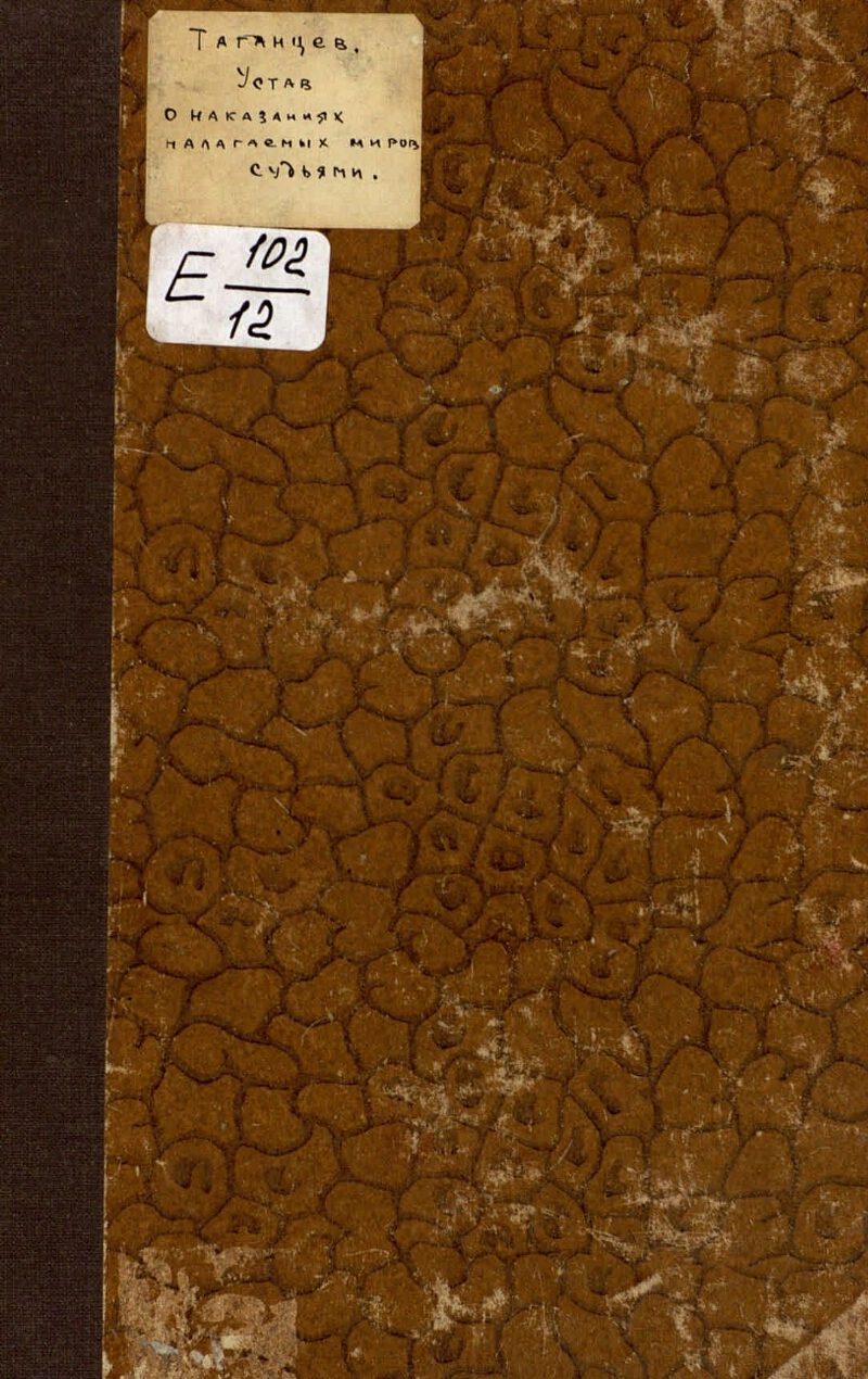 Charter of the punishments imposed by magistrates: with additions to January 1, 1879: with adj. motives and extracts from the decisions of the Criminal Cassation Department of the Senate / comp. NS Tagantsev [aut. pref. N. S. Tagantsev]. - Ed. 2-epererab. and additional. - St. Petersburg: Type. M. Stasyulevich, 1879. - VIII, 332 p. ; 24 cm. - The last with. incorrectly tagged: 232
