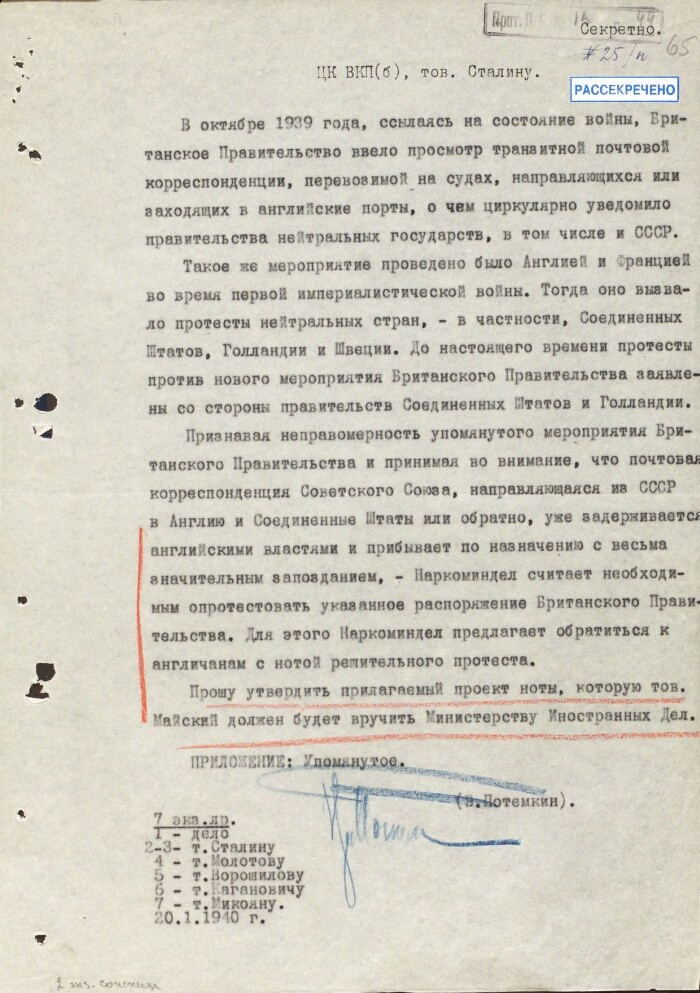 V.P. Potemkin's note to I.V. Stalin about his appeal to the British government with a note of protest regarding the viewing of transit mail correspondence of neutral countries by the British authorities