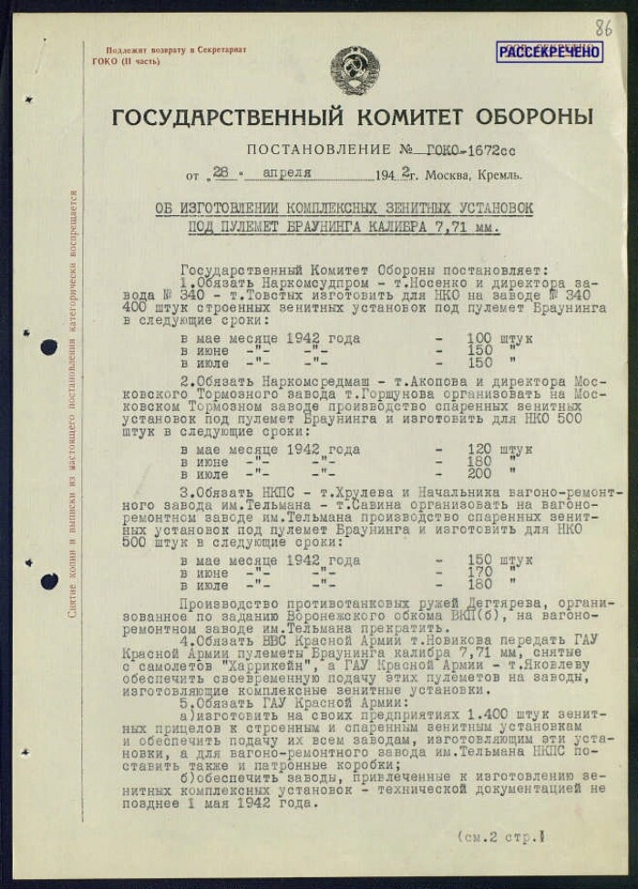 Decree of the USSR GKO No. 1672 SS on the manufacture of complex anti -aircraft guns for a machine gun of a 7.71 mm boiling machine gun, with the application of notes by Ordintsev G. A. Poskrebyshev A. N., Beria L.P., Yakovleva N. D. Stalin I. V. Stalin