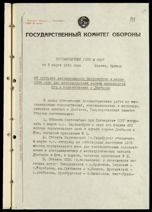Resolution of the USSR GKO No. 5307 on the shipment of timber drugs for the construction in March 1944 to restore ferrous metallurgy of the south and water supply in the Donbass, with the application of timber loading schedules.March 5, 19441944.